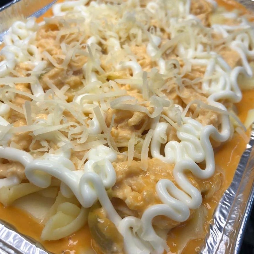 Lasanha recheada com frango refogado, Catupiry e finalizada com molho rosê. Acompanha arroz e salada de brinde.