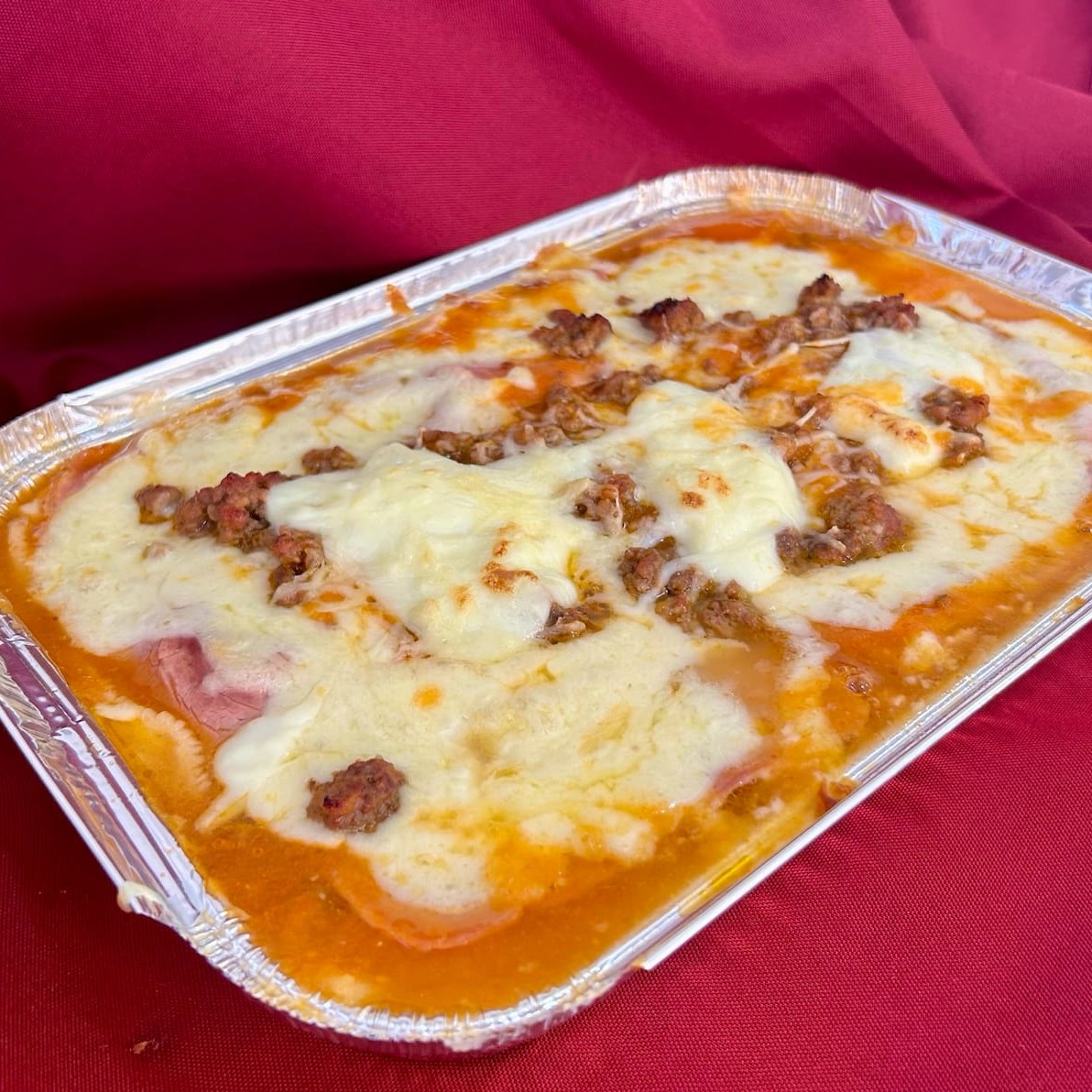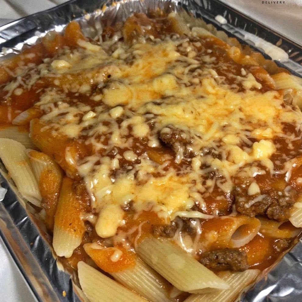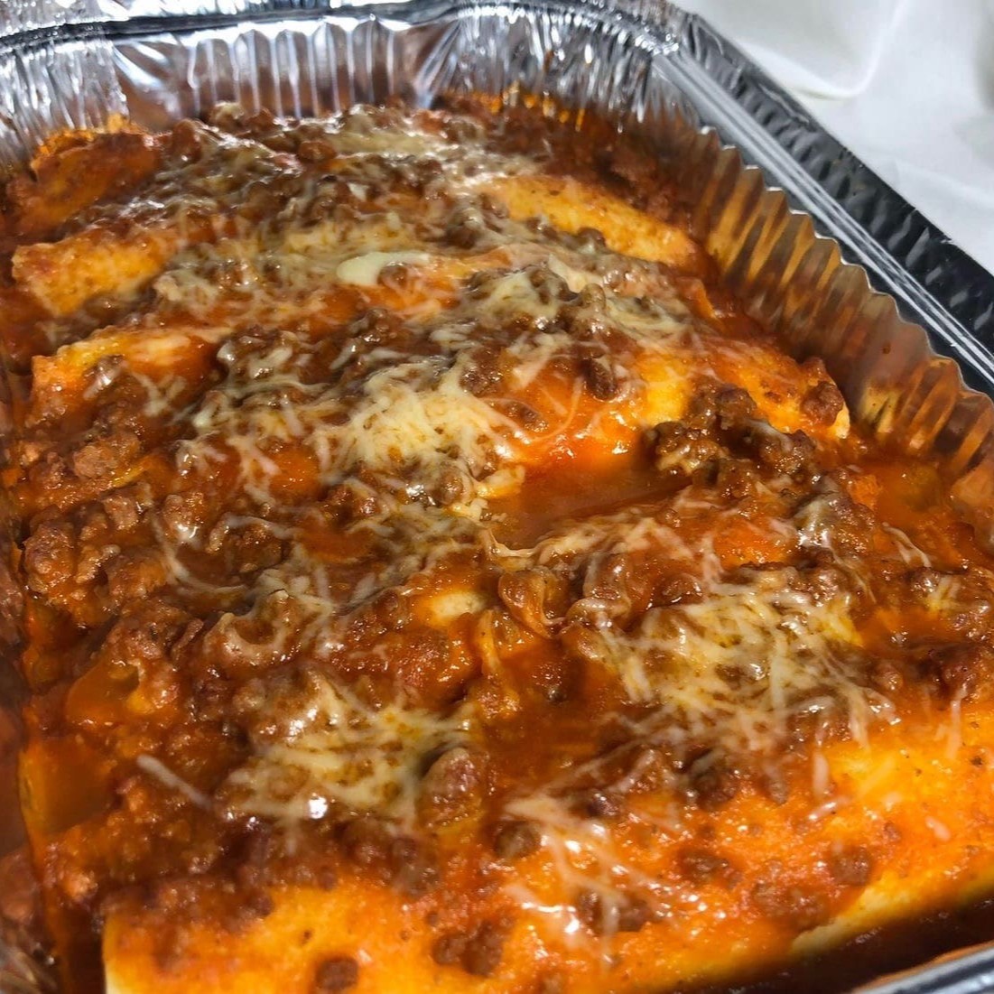 Lasanha recheada com presunto, mussarela, um leve toque de molho branco e finalizada com molho de tomate artesanal com carne moída. Acompanha arroz e salada de brinde.
