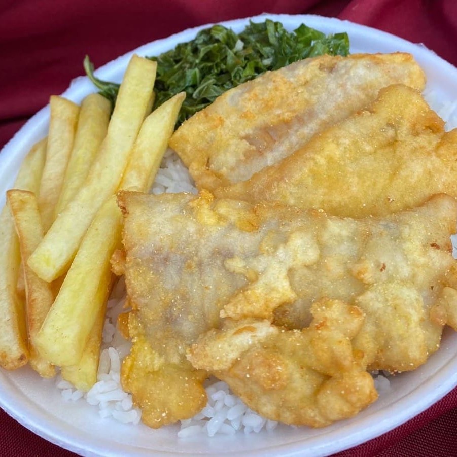 Arroz, feijão, filé de merluza, batata frita e acelga refogada. Acompanha salada.