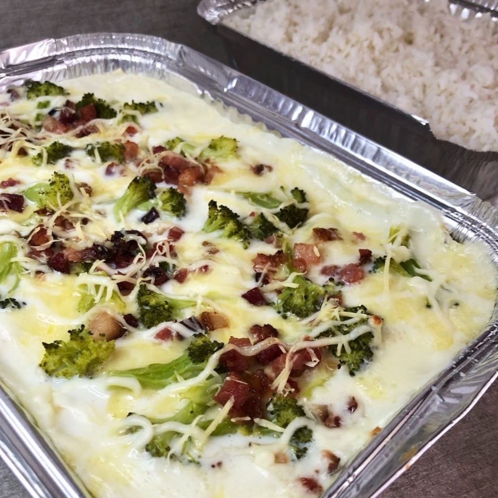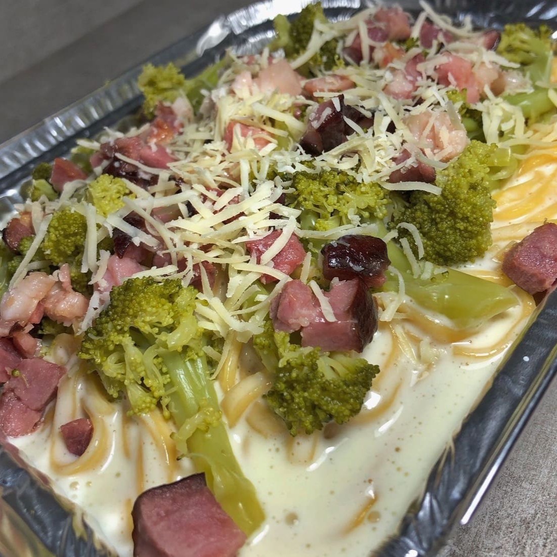 Lasanha recheada com brócolis, bacon, mussarela e finalizada com molho branco. Acompanha arroz e salada de brinde.
