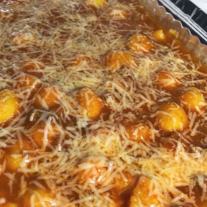 Nhoque recheado com mussarela. Acompanha arroz e salada.