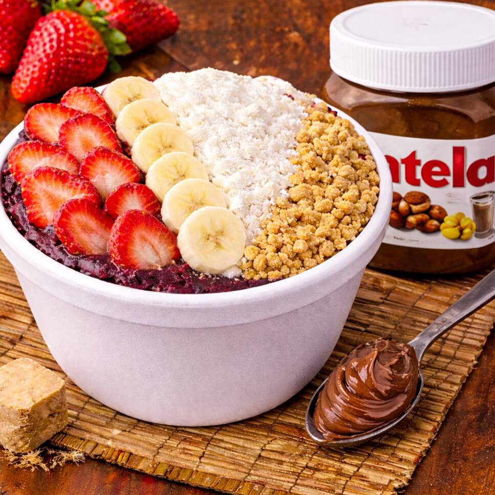 Açai +4 Complementos inclusos a sua escolha! + Pote de Nutella 140g Delicioso Acompanhado com seus complementos favoritos!! Saboreie o autêntico Açaí 360, 100% Artesanal, produzido com a polpa da fruta e com redução de açúcar – uma experiência saudável e irresistível!