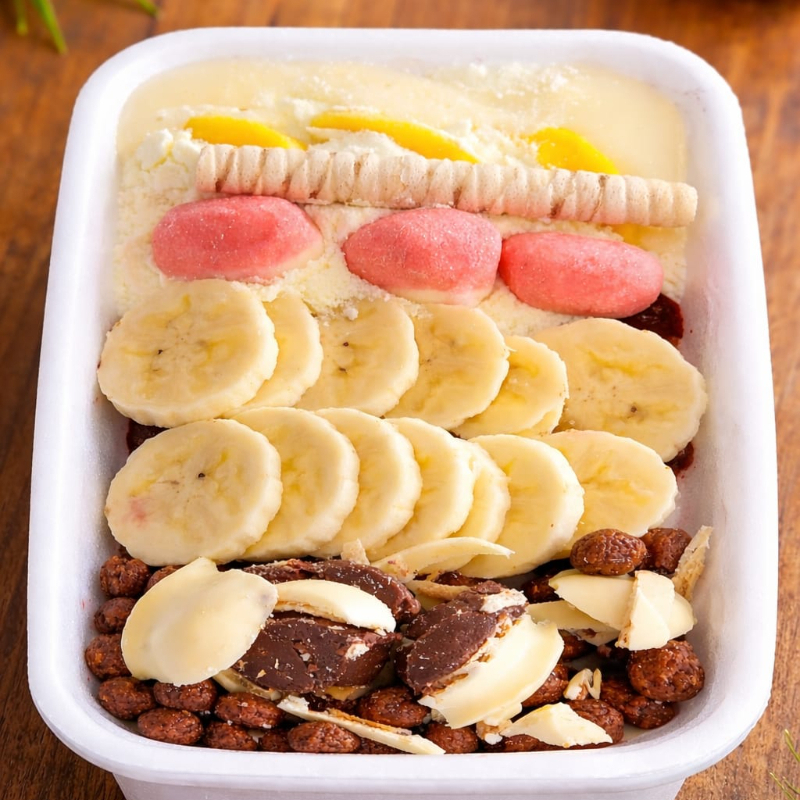 Açaí, Leite condensado, Leite em pó, banana, nescau balls, Ouro branco, beijos docile, bananinhas docile e biju. Aprox. 380g