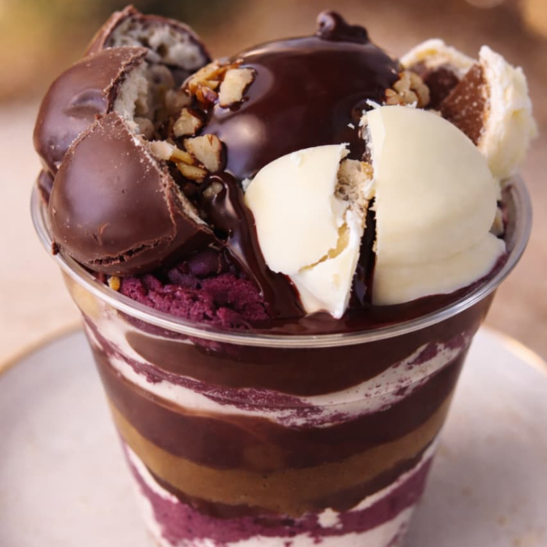 Açaí, mescla de chocolate branco com coco e castanhas, sorvete de raffaello, leite em pó, bombom raffaello