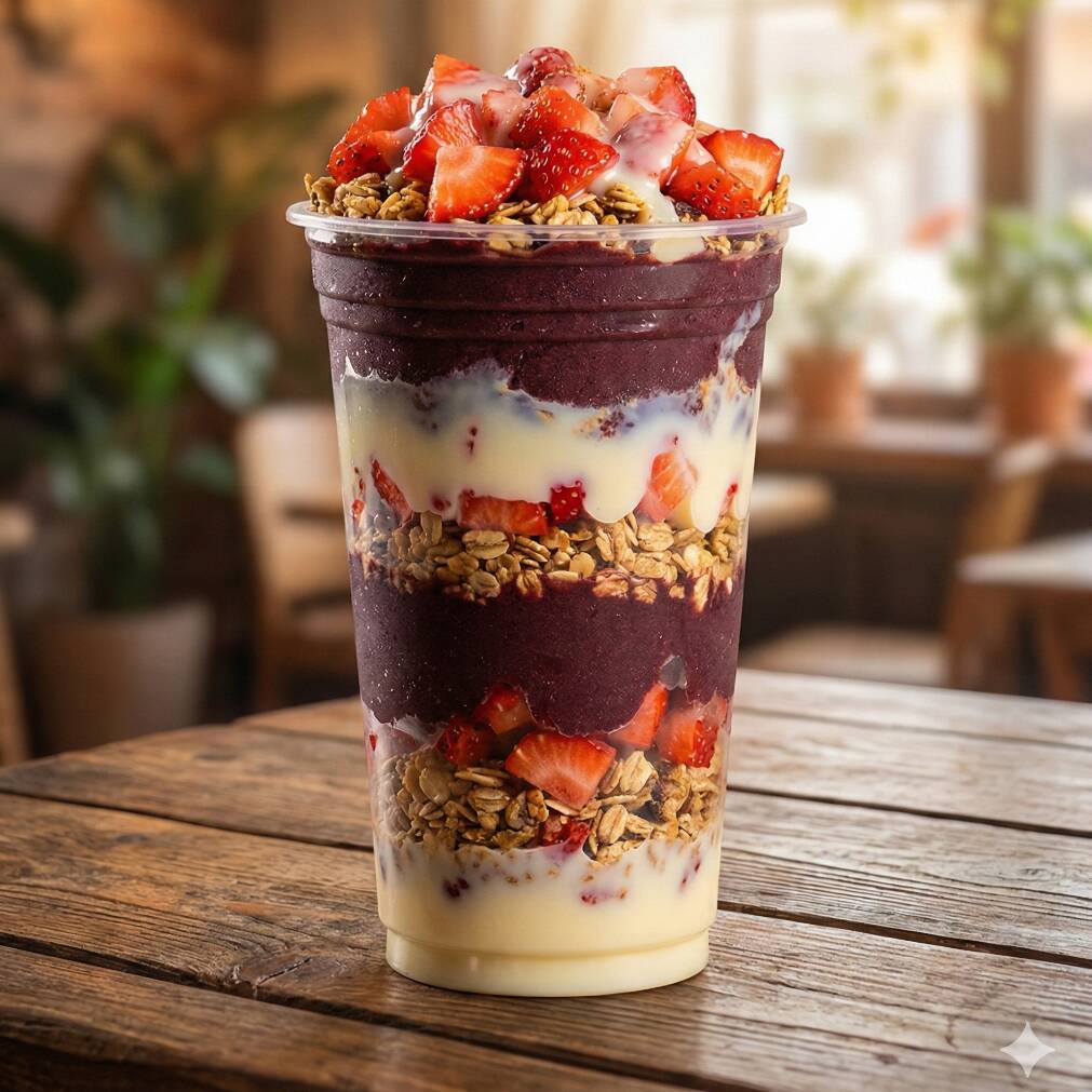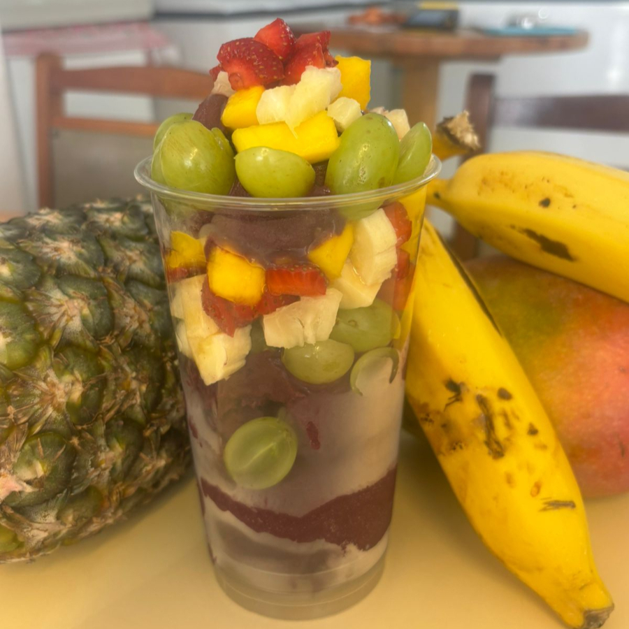 Açaí, leite em pó, leite condensado, morango, banana, abacaxi, uva verde sem semente e manga