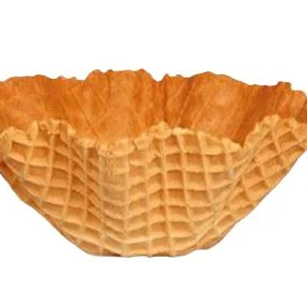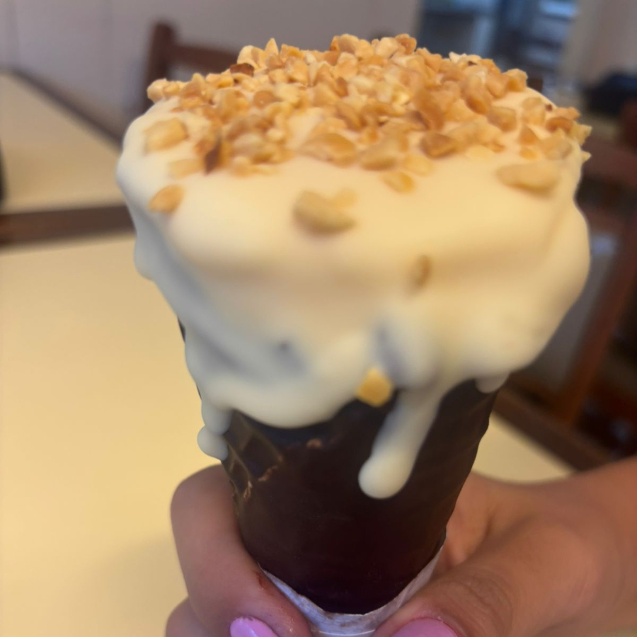 Cascão revestido por dentro e fora com chocolate meio amargo, fundo de creme de avelã com cacau, recheio de sorvete de chocolate branco, coberto com calda quente de chocolate branco e salpicado com amendoins torrados