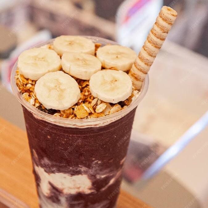 (CLIENTE ESCOLHE) entre Delicioso açaí com banana fruta, granola e/ou leite em pó.