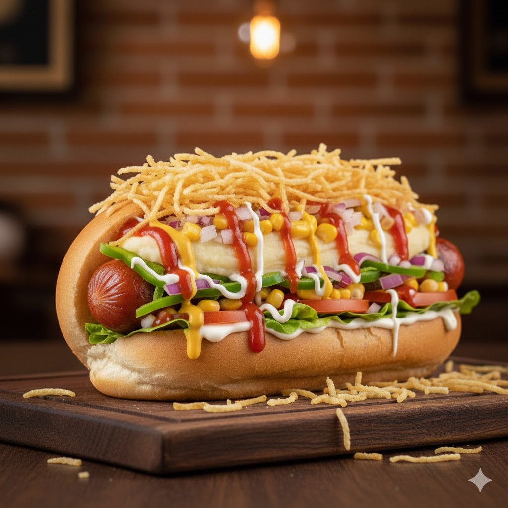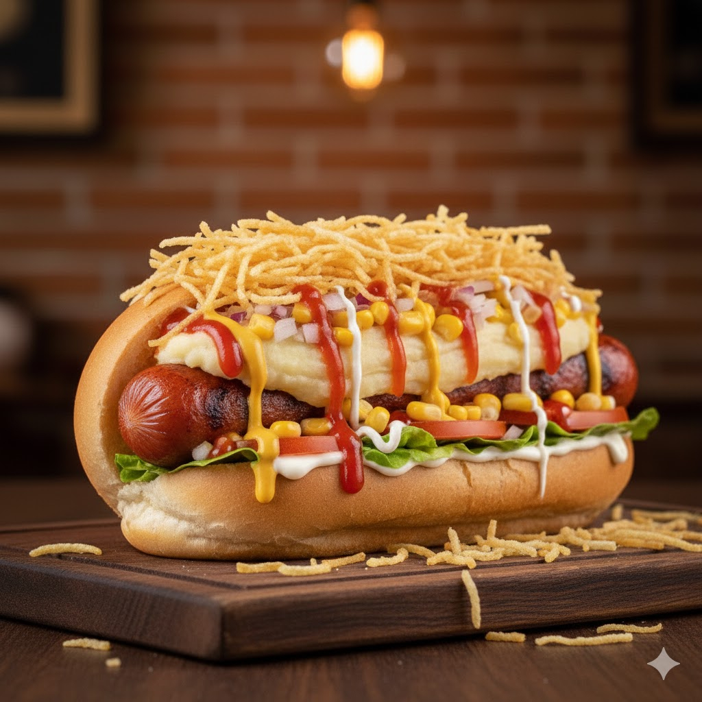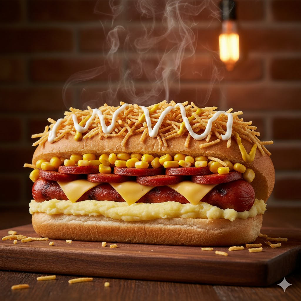 Salsicha, calabresa, queijo, purê, milho, molho e batata palha, uma combinação irresistível.