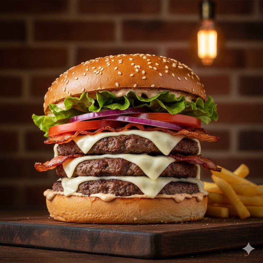 3 hambúrgueres de 100g cada, bacon, queijo, cebola e alface, tomate..uma explosão de sabores.