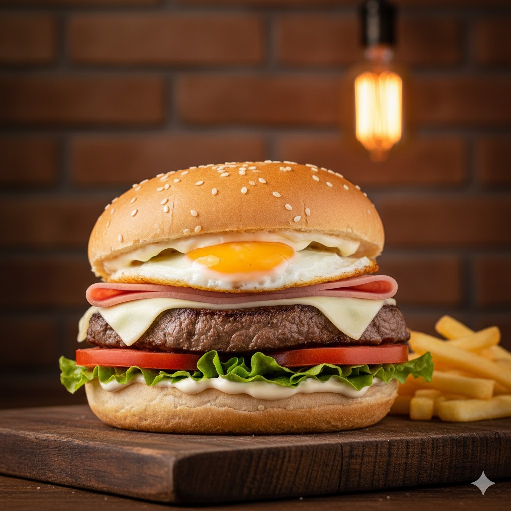 Hambúrguer, presunto, queijo, ovo, bacon, calabresa, milho, cheddar e salada, uma explosão de sabores.