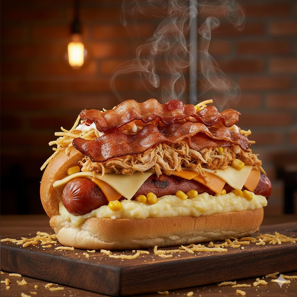 Salsicha, frango, bacon, queijo, purê, milho, molho e batata palha, uma explosão de sabores.