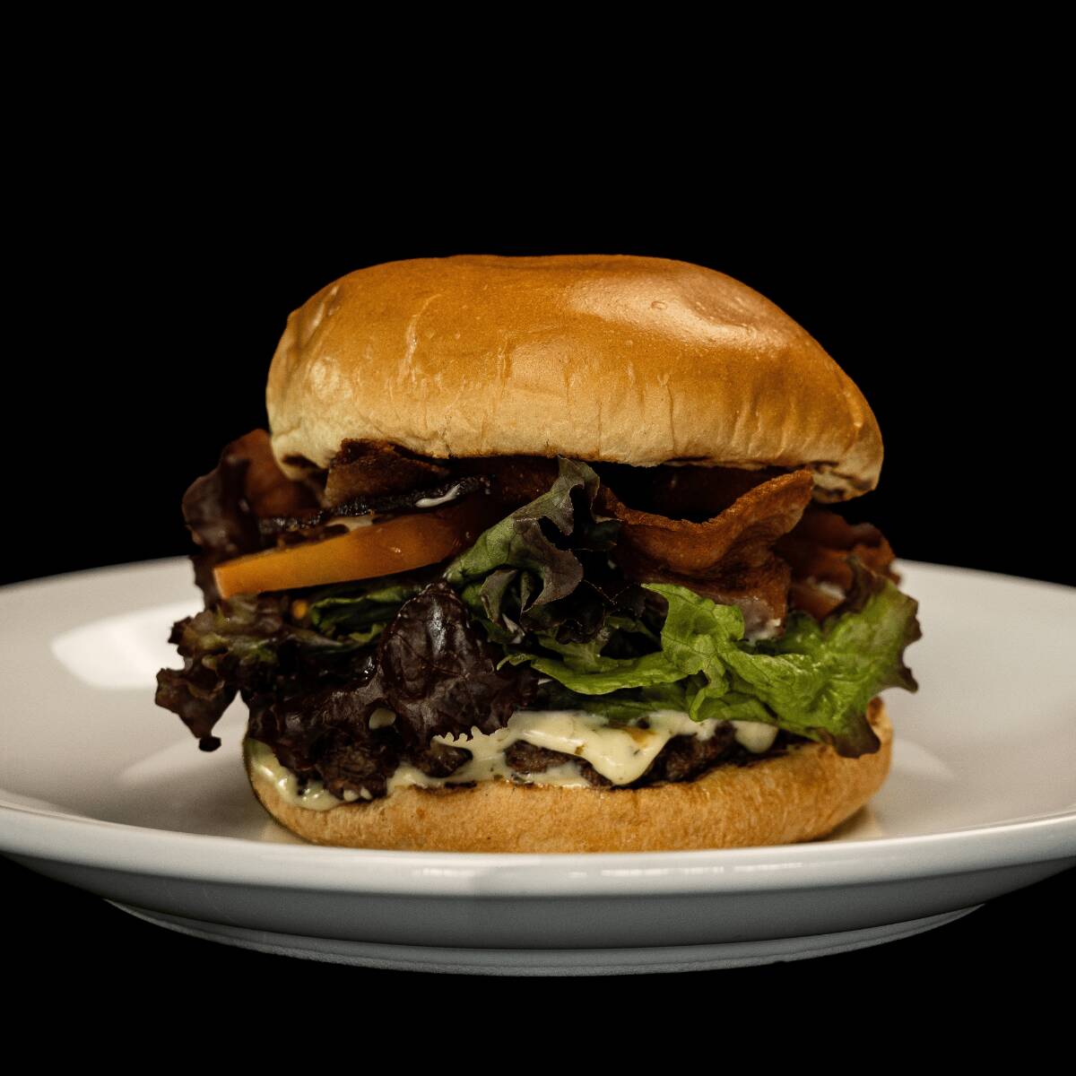 Blend de carne angus, bacon, alface, tomate e queijo cheddar no pão brioche. Acompanha fritas e maionese Âmbar.