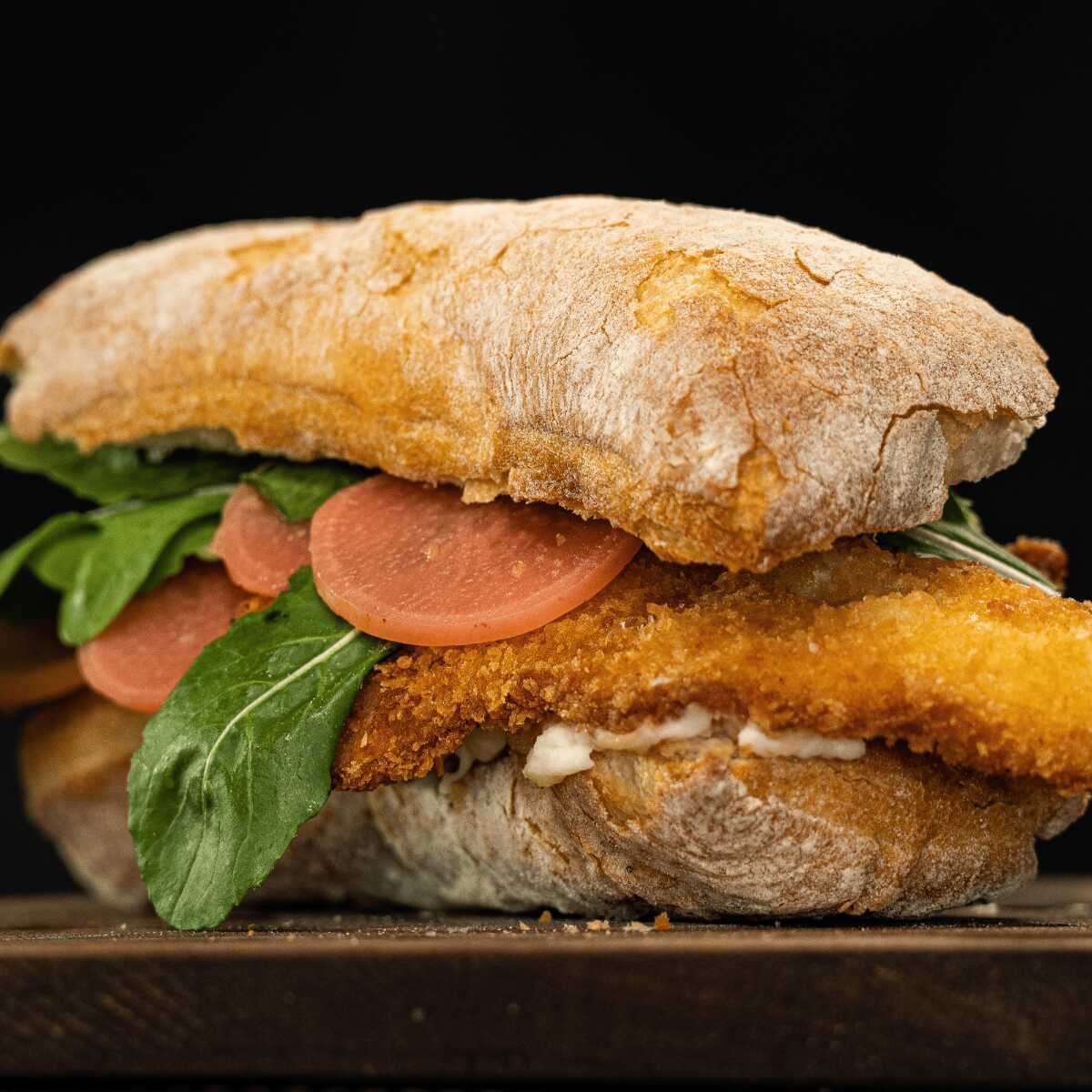 Frango frito, mussarela, catupiry, picles de rabanete e rúcula.