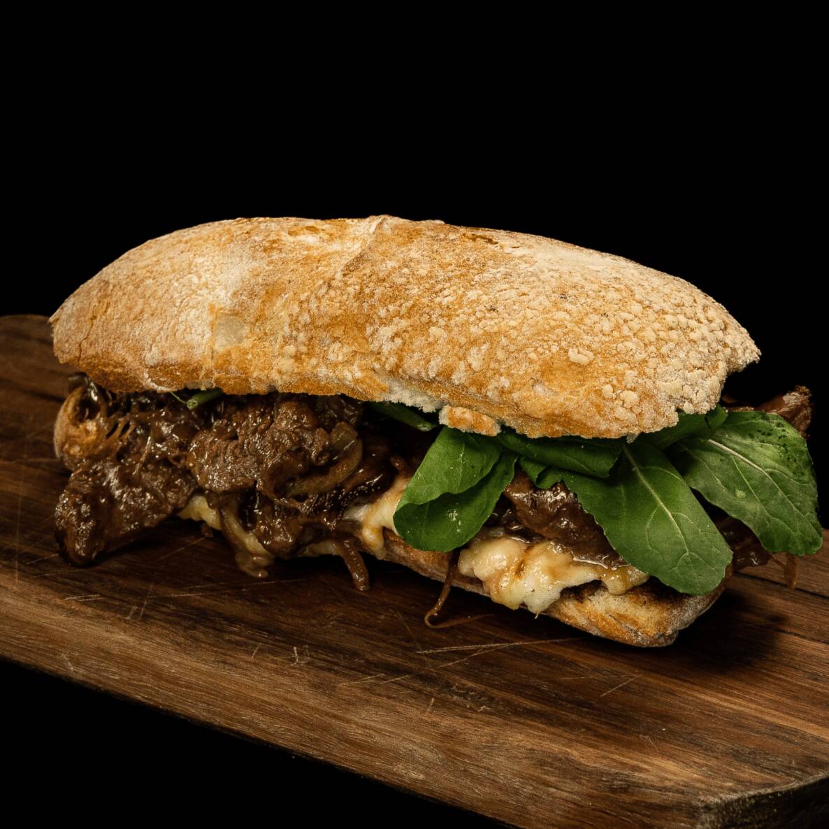 Sanduíche de pernil desfiado, vinagrete e queijo fundido. Acompanha fritas