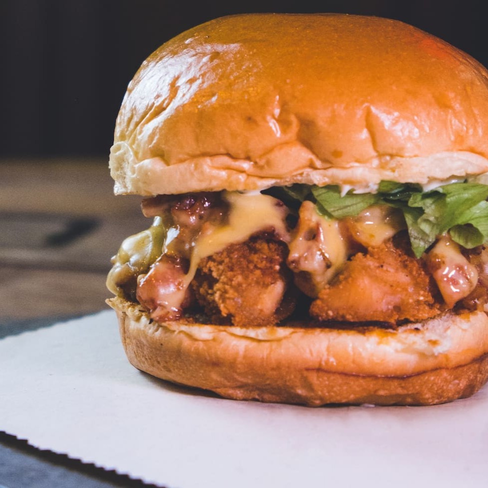 Pão de brioche, frango crocante, queijo prato, bacon crocante, alface e maionese de lemon pepper.