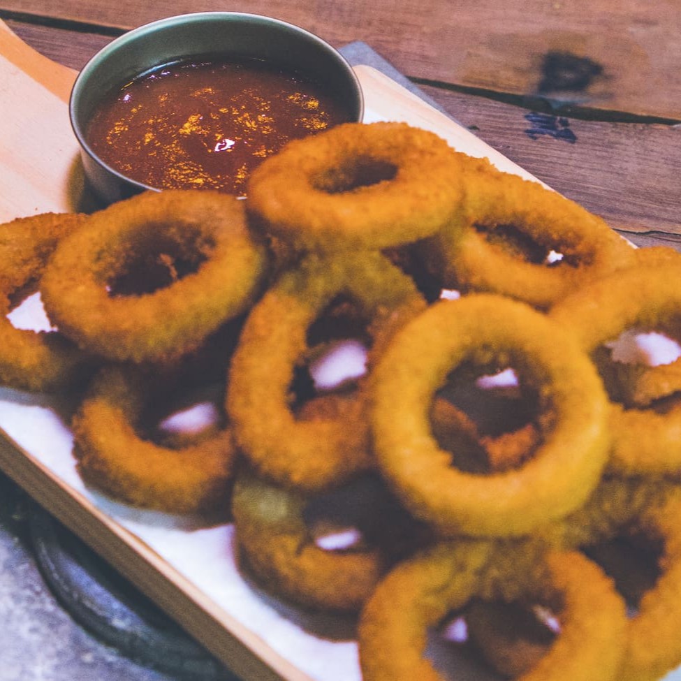 400g de anéis de cebola empanados, acompanha sweet chilli
