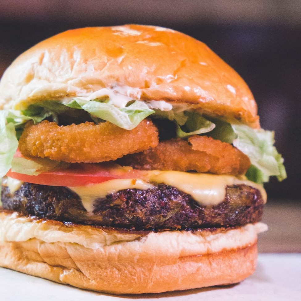 Pão de brioche, hambúrguer de grão de bico, queijo prato, alface, anéis de cebola e maionese de lemon pepper.