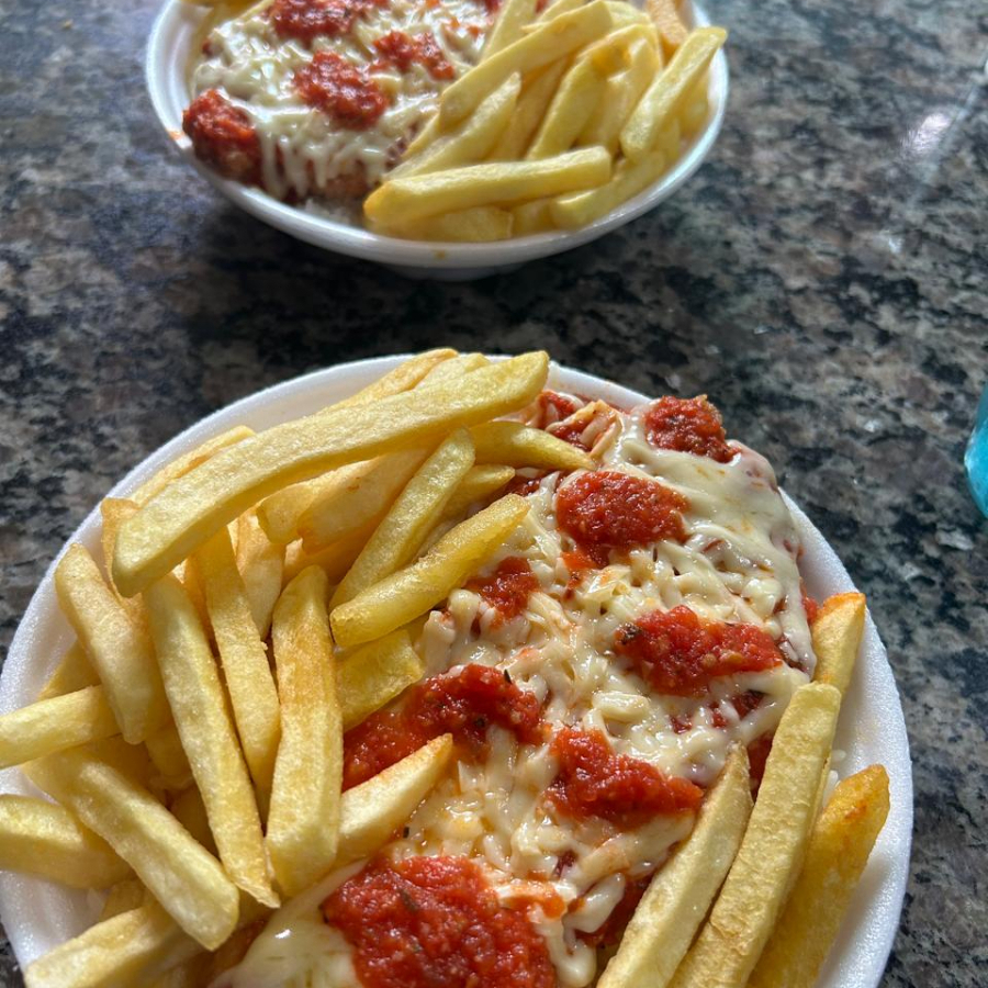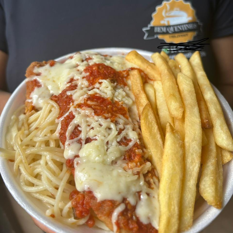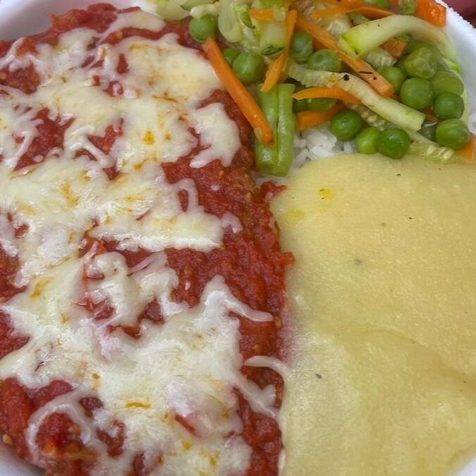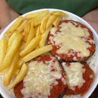 2 marmitas de parmegiana com molho caseiro e queijo de qualidade, acompanha arroz,feijão e batata frita