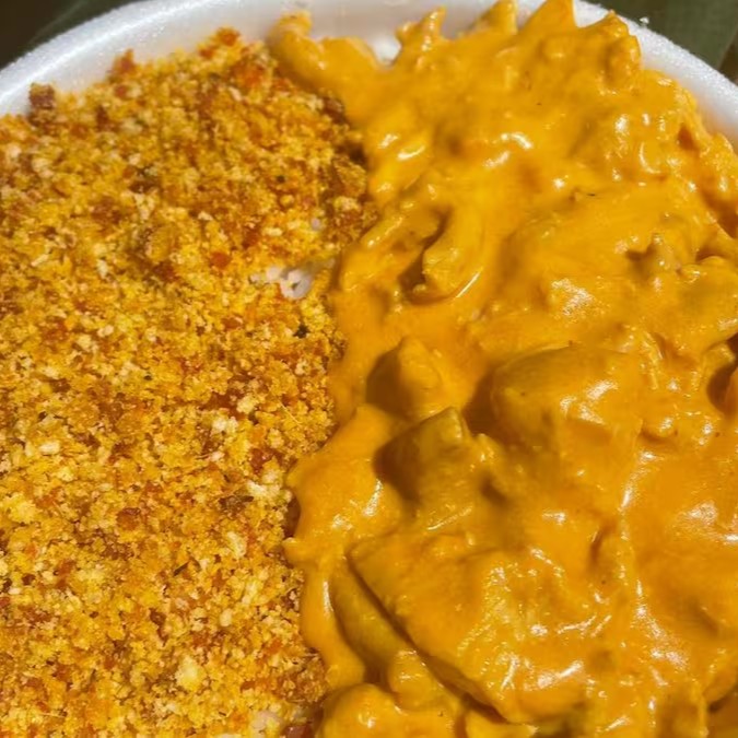 Strogonoff de frango bem cremoso. Acompanha arroz feijão e 1 acompanhamento da sua escolha