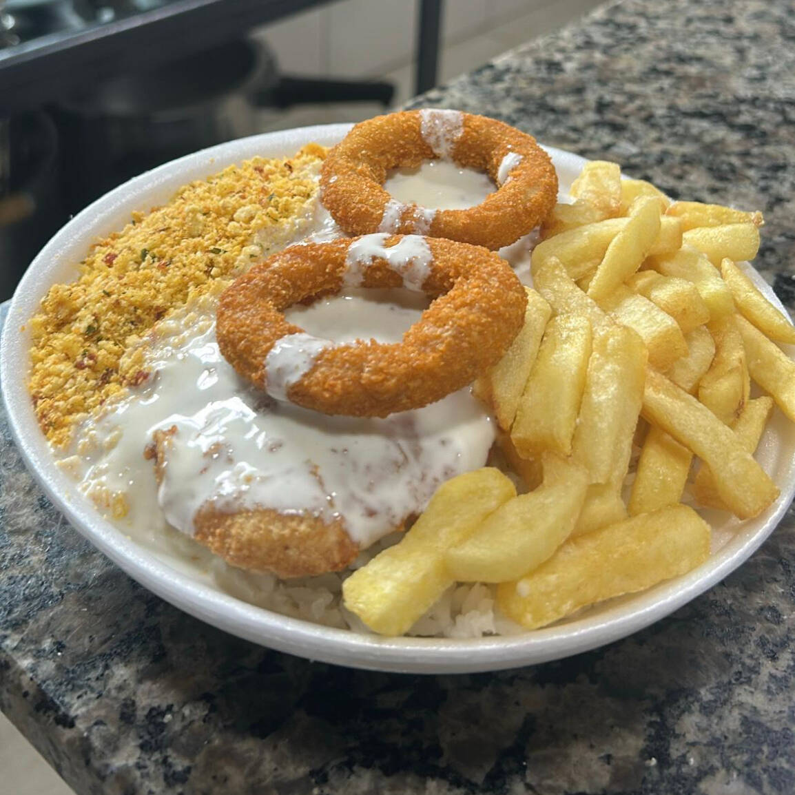 frango empanado crocante com molho de requeijão e anéis de cebola, Acompanha arroz, feijão e 2 acompanhamentos da sua escolha.