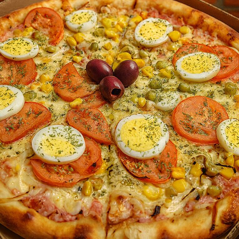 Molho especial, presunto, muçarela, ervilha, milho, tomate, cebola, ovo e azeitona preta.