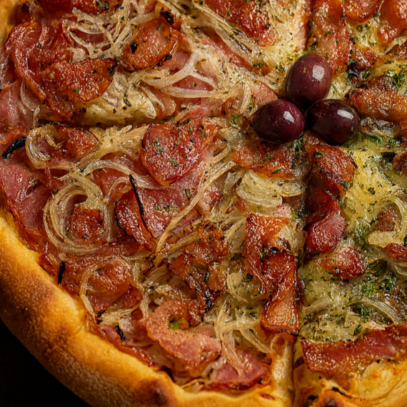 Molho especial, calabresa, bacon, cebola, requeijão, muçarela e azeitona preta.
