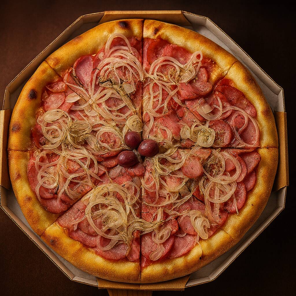 Molho especial, calabresa fatiada, bacon, cebola e azeitona preta.
