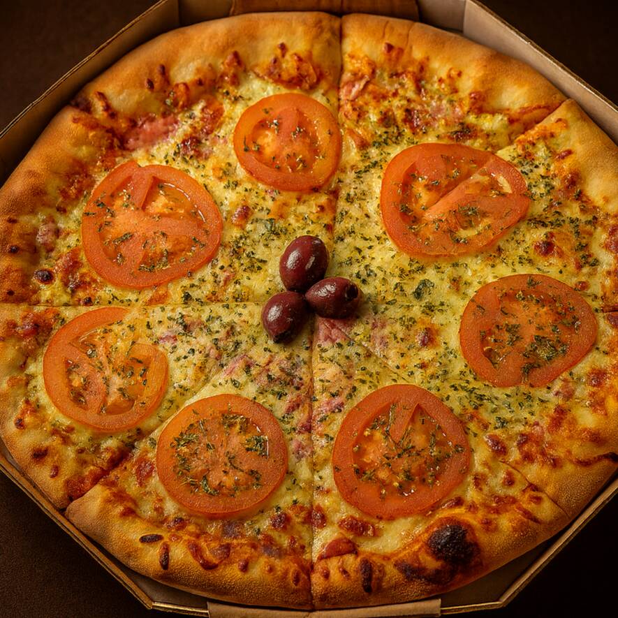 Molho especial, presunto, muçarela, tomate e azeitona preta.