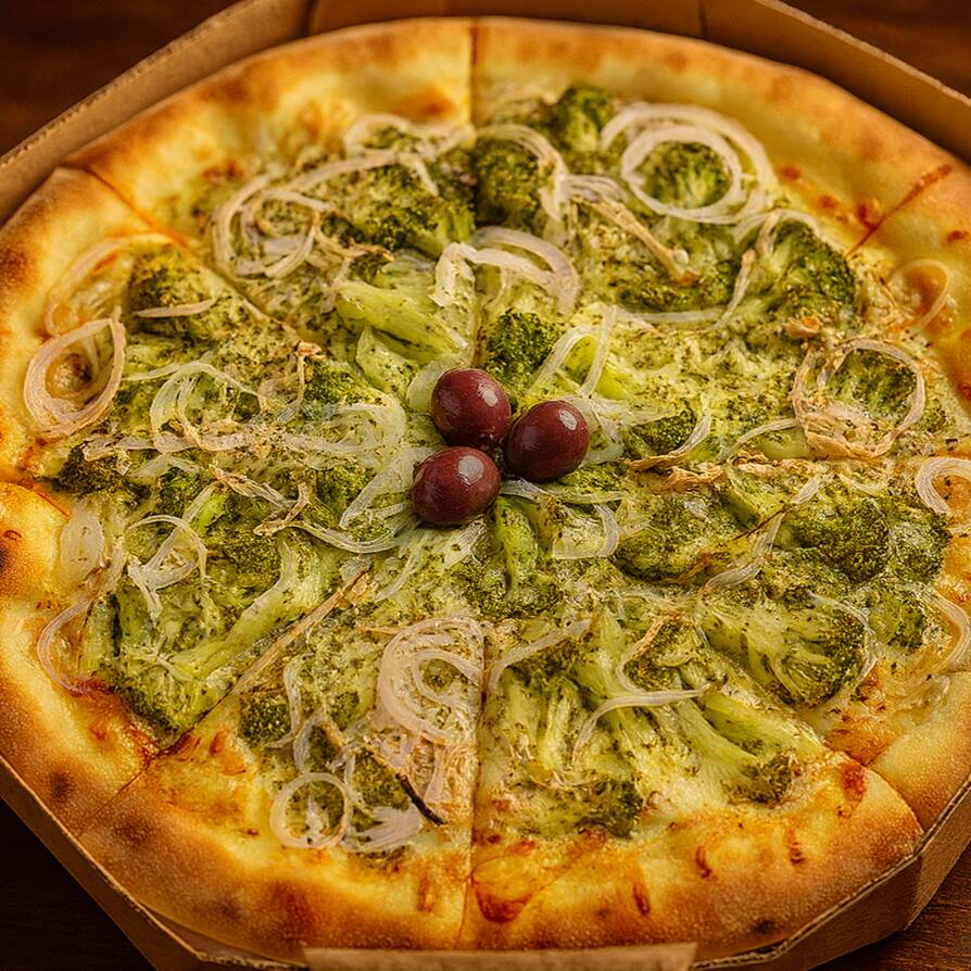 Molho especial, brócolis, muçarela, bacon, cebola e azeitona preta.