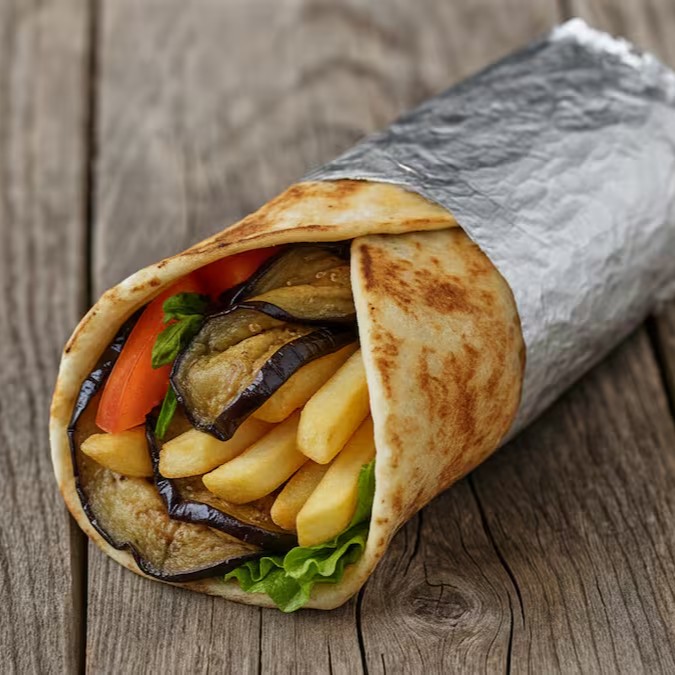 Berinjela bem temperadinha, Alface, Tomate, Cebola em rodelas finas, Batata frita, um Molho de alho feito com muito carinho envoltos em um pão sírio artesanal. Importante: Contém pimenta síria, canela, zaatar entre outros temperos.