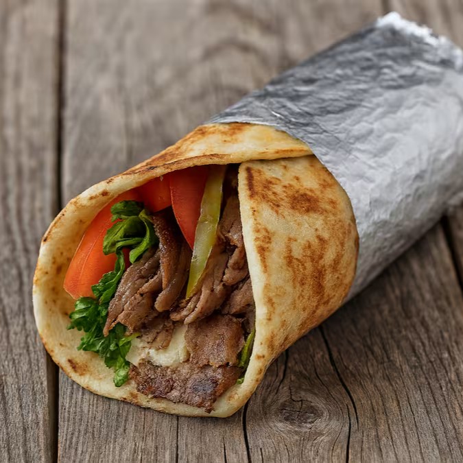 Carne de Angus desfiada bem temperadinha, Alface, Tomate, Cebola em rodelas finas, Batata frita, um Molho de alho feito com muito carinho envoltos em um pão sírio artesanal. Importante: Contém pimenta síria, canela, zaatar entre outros temperos.