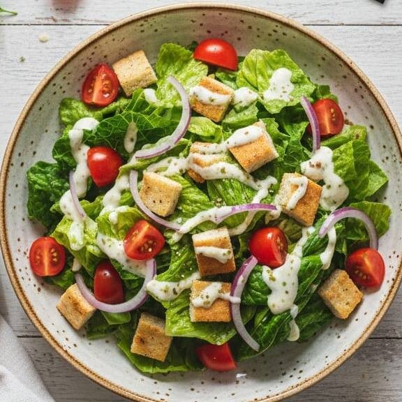 Alface fresquinha, tomate em rodelas, cebola roxa bem fininha, croutons de pão sírio crocantíssimo, coberto por aquele molho de alho! Contém pimenta e especiarias (!!!alérgicos!!! Por gentileza citar nas observações).