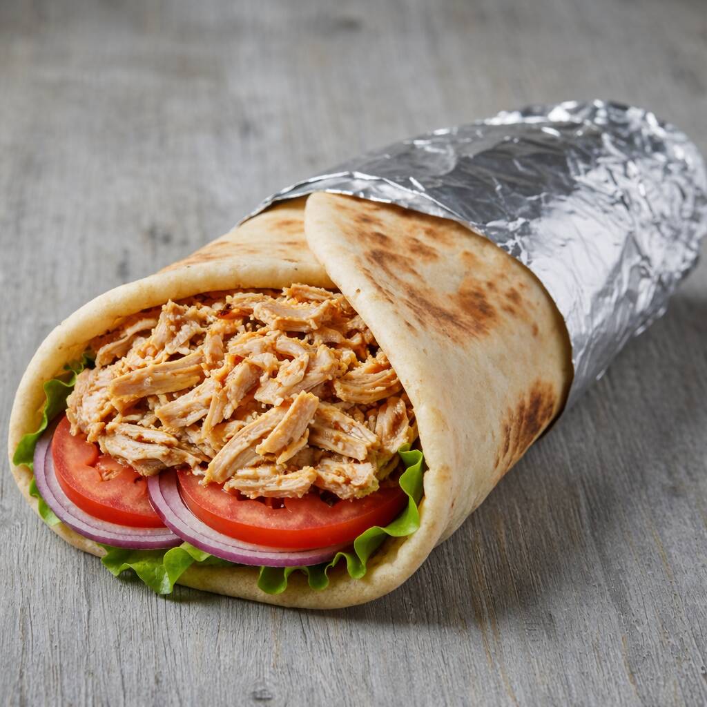 Tirinhas de frango bem temperadinhas, Alface, Tomate, Cebola em rodelas finas, Batata frita, um Molho de alho feito com muito carinho envoltos em um pão sírio artesanal. Importante: Contém pimenta síria, canela, zaatar entre outros temperos.