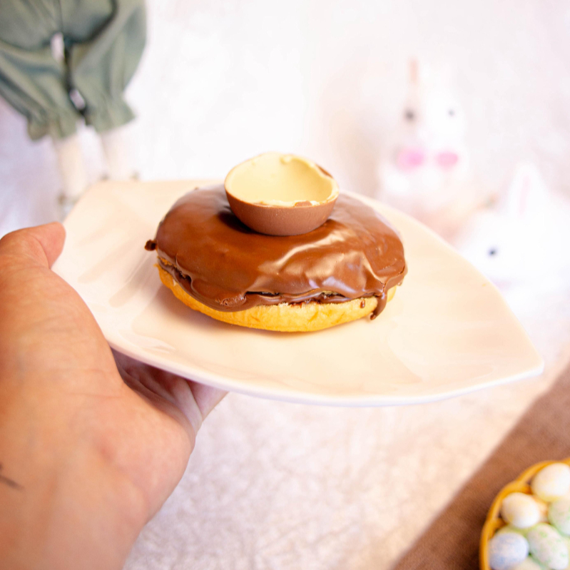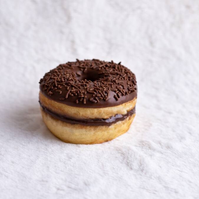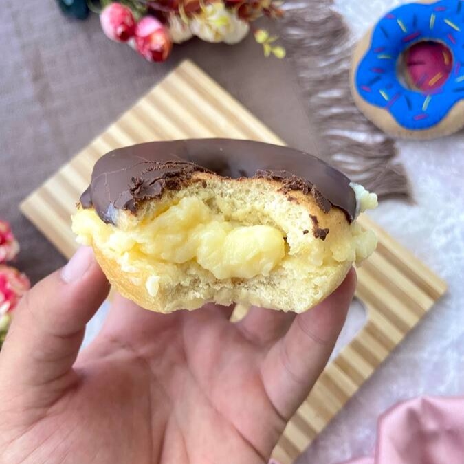 Massa macia, recheio de creme de confeiteiro aveludado e uma camada de chocolate nobre por cima. Sabor que lembra vitrines americanas, café quente e aquela pausa gostosa no meio do Dia.