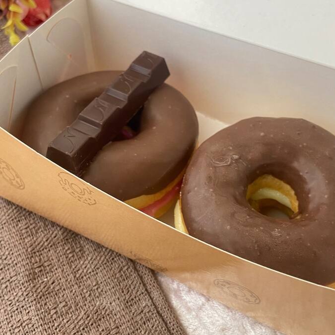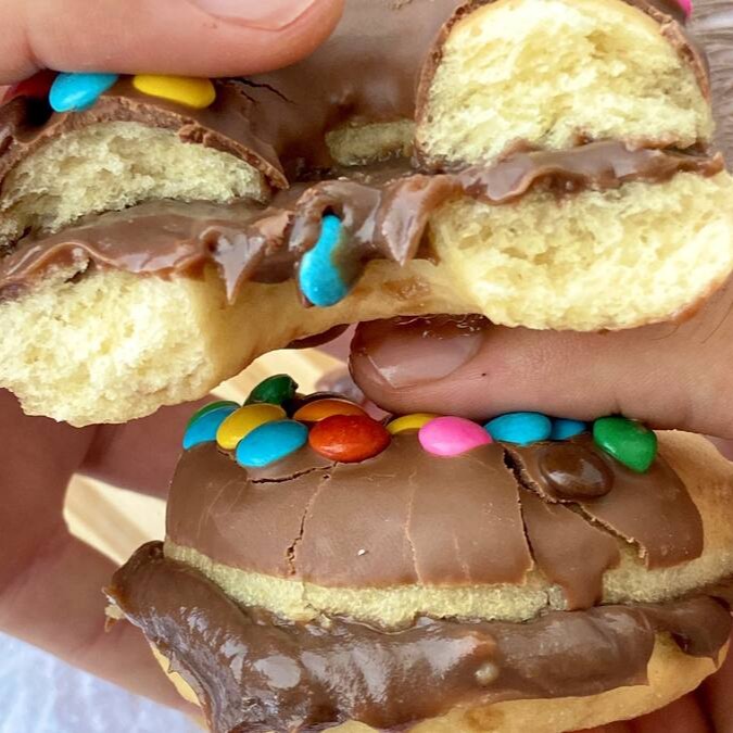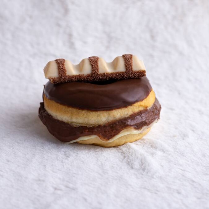 Deliciosamente recheado com creme branco de avelã combinado com Nutella Original, coberto com chocolate nobre e finalizado com o próprio Kinder Bueno. Um donut cheio de charme, cremosidade e encanto em cada mordida.