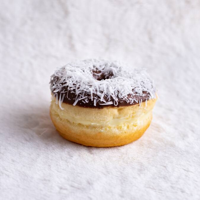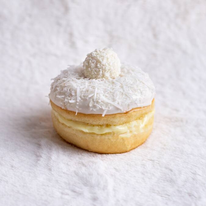 Um donut que conquista pelo cuidado: creme branco de avelã, chocolate branco, coco e Raffaello. Leve, envolvente e perfeito pra quem gosta de doce com carinho