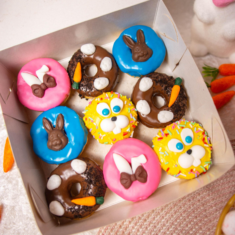 Caixa com 10 donuts personalizados de Páscoa: 5 donuts em formato de cenoura. 5 donuts em formato de coelho. Todos passados no Leite Ninho e finalizados com uma deliciosa camada de Nutella por cima.
