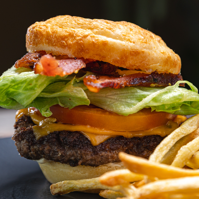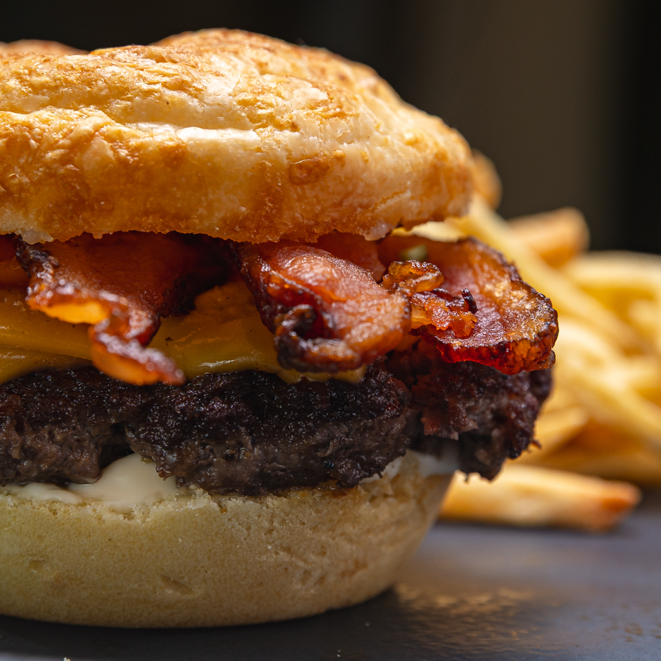 Ingredientes: Bacon, Hambúrguer 120g, Maionese Defumada, Pão de Queijo, Queijo Cheddar Fatiado