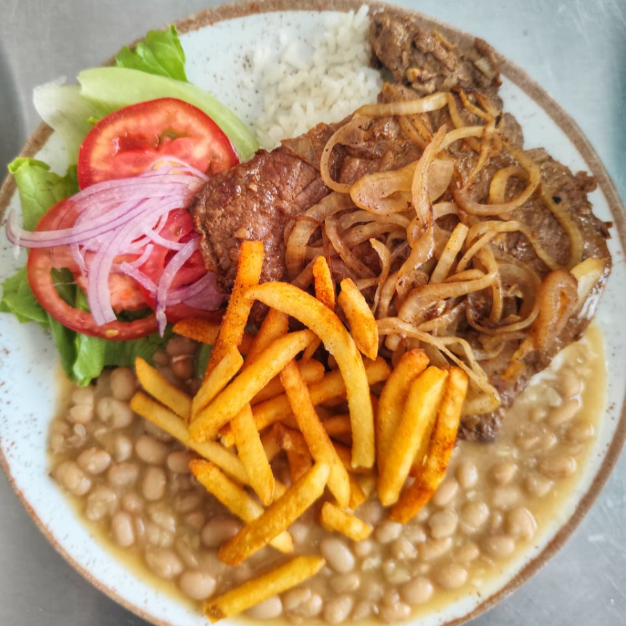 Bife Acebolado, Arroz, Feijão, Batata Frita, Salada de Alface com Tomate e Cebola Roxa.