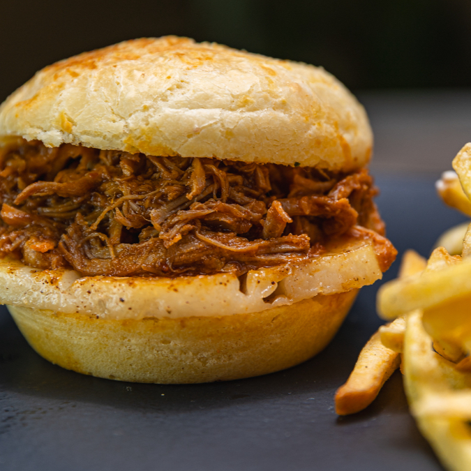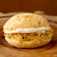 Ingredientes: Frango Desfiado 120g, Maionese Defumada, Pão de Queijo, Queijo Prato