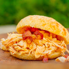 Ingredientes: Cheddar Cremoso, Frango Desfiado 120g, Maionese Defumada, Pão de Queijo, Queijo Prato