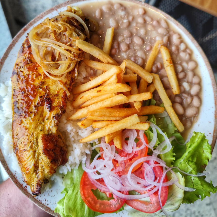 Frango Grelhado, Arroz, Feijão, Batata Frita e Salada de Alface com tomate e cebola roxa.