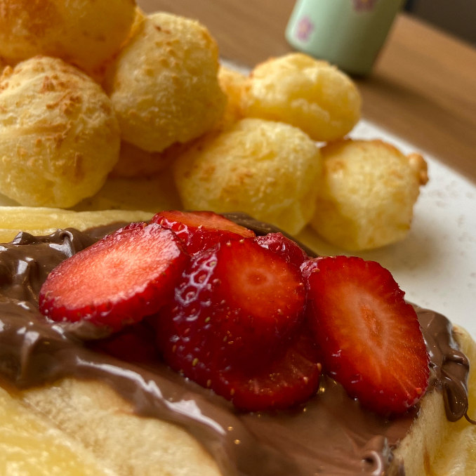 Ingredientes: Waffle de Pão de Queijo 90g, Morango e Nutella