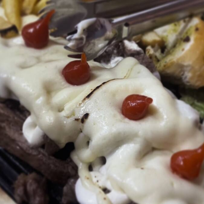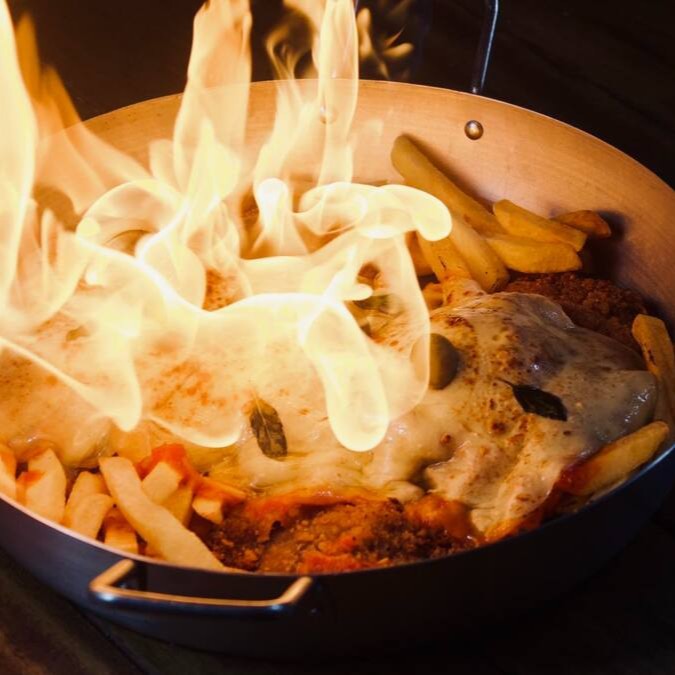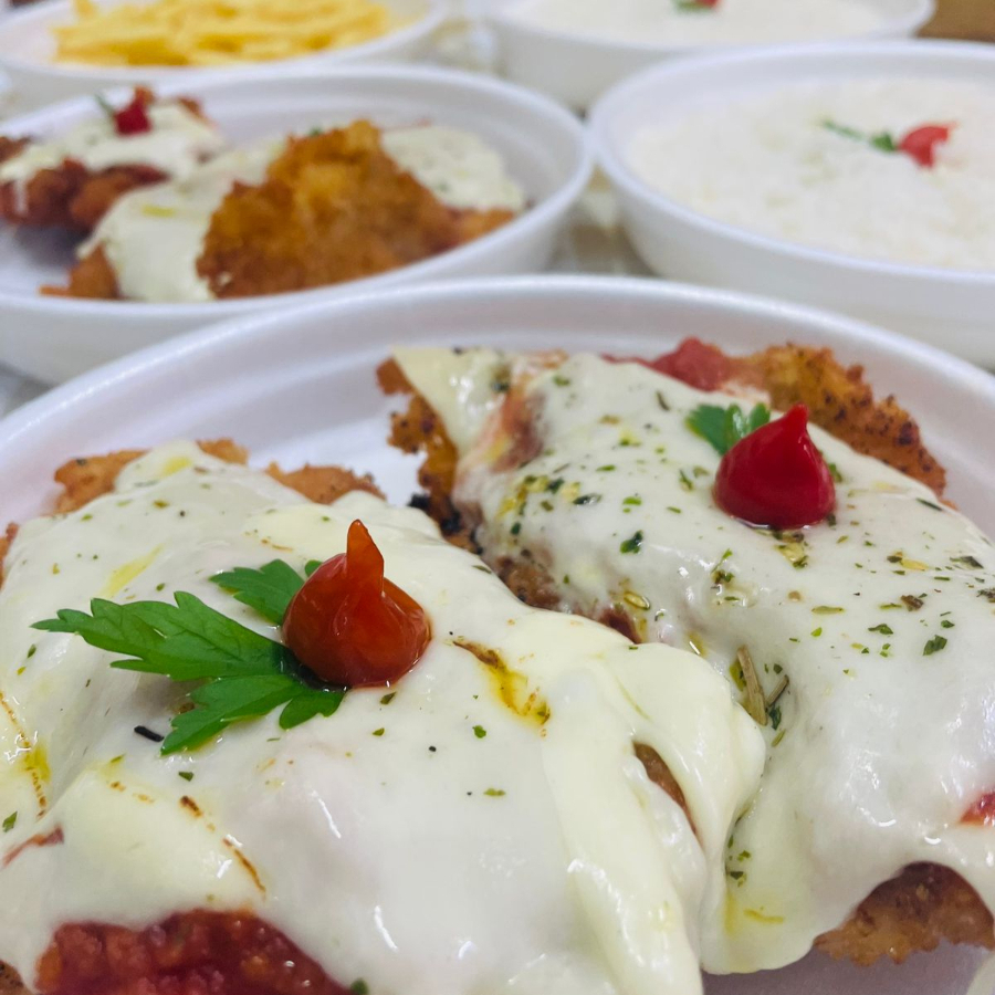 Parmegiana de alcatra, acompanha, arroz, feijão, fritas, farofa, e molho da casa. Servem ate 3 pessoas.