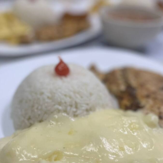 Pure de mandioca com queijo mussarela, arroz, e farofa.