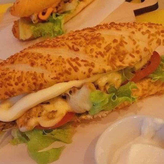 Pão baguete, Frango em cubos, queijo, alface, tomate, acompanha molho da casa.