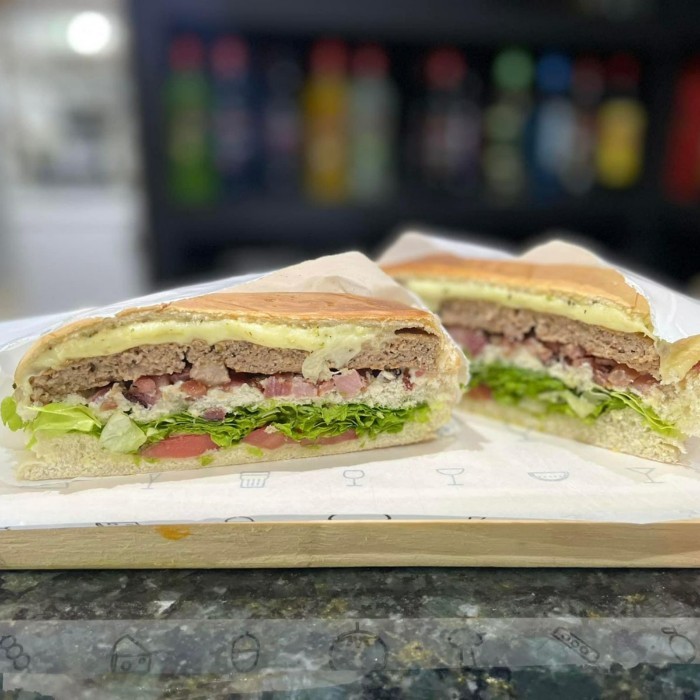Pão de hambúrguer, filé de frango, queijo, ovo, bacon, presunto, calabresa, alface, tomate e maionese.