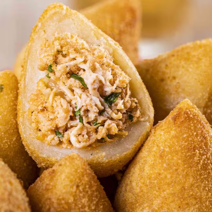 Coxinha crocante por fora e macia por dentro, recheada com frango temperado e finalizada com muito cheddar cremoso e derretido. Uma combinação irresistível, perfeita para qualquer hora do Dia.