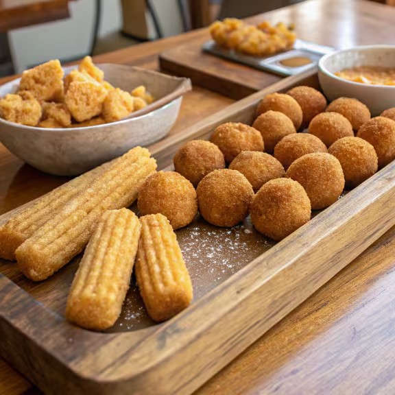 40 Mini Salgadinhos Fritos + 10 Mini Churros: Combinação perfeita de salgados crocantes e churros doces recheados!