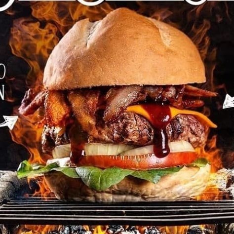 Pão rústico artesanal, bacon molho barbecue, cheddar, burguer 180g, cebola, tomate e rúcula. Acompanha Fritas Individual